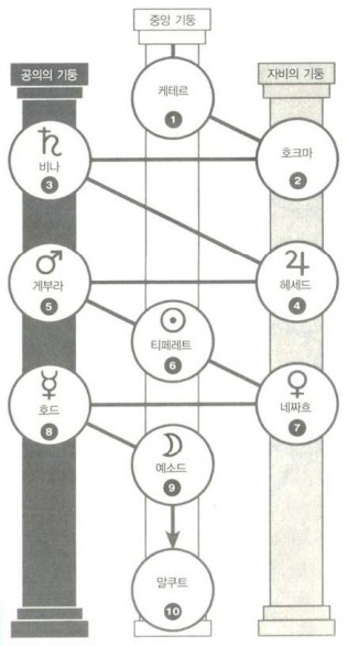 카발라의 생명나무는 열 개의 세피로트sephiroth를 세 개의 기둥에 배치한 것으로, 각 세피라Sephirah(세피로트의 단수형)는 창조적 진화의 각 단계에 따른 에너지(힘)의 위계와 속성이 담겨 있다.