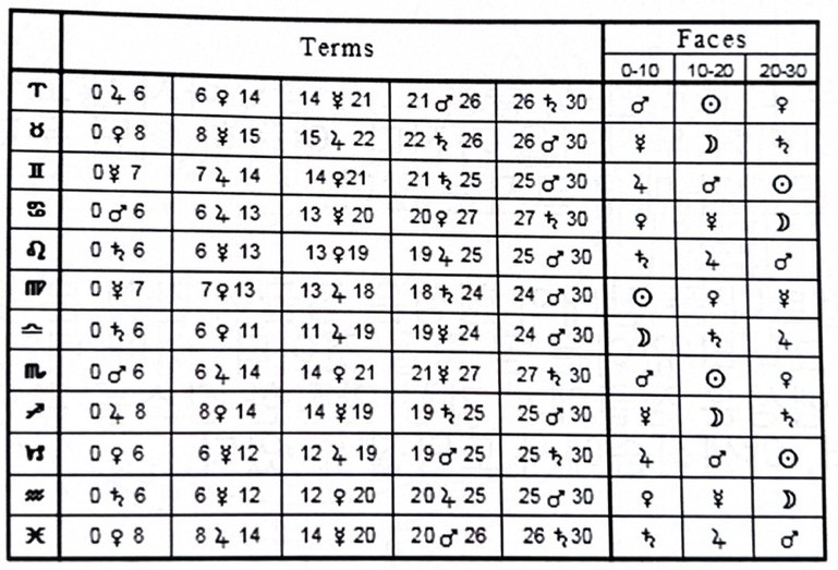 페이스(Face)는 데칸이라고도 하며, 이집트에서 발생했다. 각각의 조디악 사인을 10도씩 나누어서 3등분한다. 10도마다 다스리는 행성이 있다(칼데아 오더 순서). 페이스를 얻는 행성은 좋은 옷과 장신구를 걸친 사람과 같다. 페이스도 마이너 디그니티이며, 잘 쓰이지는 않는다.