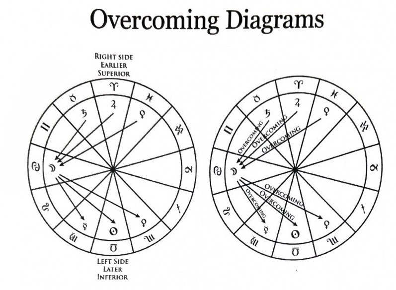 압도하는 애스펙트 또는 더 우월한 애스펙트. 행성A가 행성B를 조디악 순서로 왼쪽으로 에스펙트하면 A는 B보다 더 우월한 위치에서 애스펙트한다고 간주한다. 행성B의 입장에서 행성A를 오른쪽으로 에스펙트하기 때문에 행성B는 더 열등한 위치에 있다고 본다. 이러한 구조를 행성A는 행성B를 오버컴한다고 부른다.