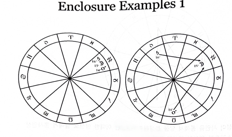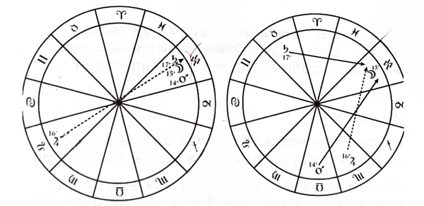 왼쪽 그림은 달이 토성과 화성에게 포위 당해서 매우 좋지 않은 상황에 놓였으나 목성이 어포지션으로 토성과 화성의 포위구조를 벗어나게 해준다. 달이 토성에게 다가가기 전에 목성에게 먼저 에스펙트를 이룬다.
