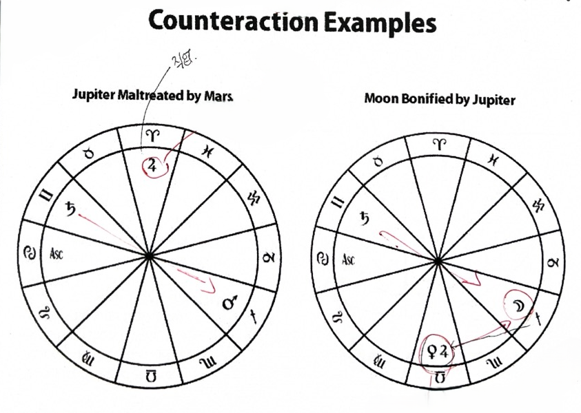 길성과 흉한 애스팩트를 이루는 행성은 길성의 도움을 받지만, 그 도움이 균형잡힌 방식이 아닐 수도 있다. 흉성과 길한 애스펙트를 이루는 행성은 흉성의 힘겨움을 경험하나 약간의 이익을 얻을 수도 있다.
