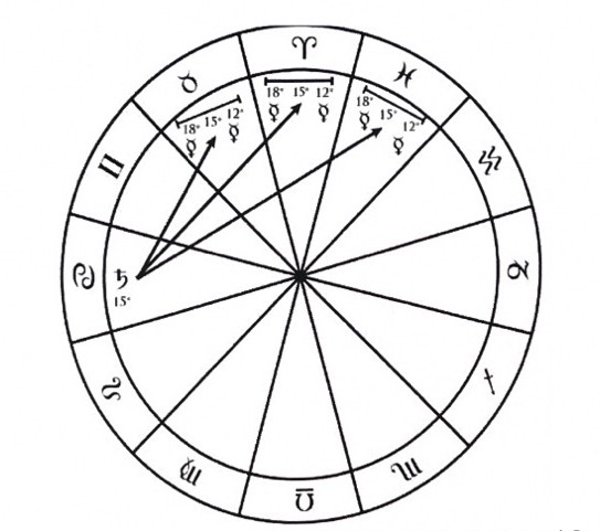 두 행성이 0도, 60도, 90도, 120도, 180도 떨어져 있으면 도수 기반의 정확한 애스펙트를 이루게 된다.